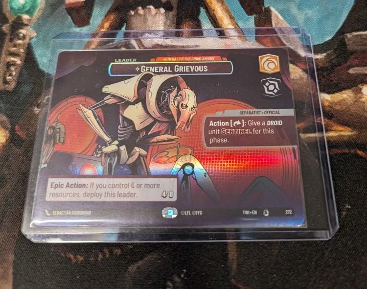 Cardboard Games: 5 rounds Bo1, I placed 1st; Alyssa placed 6th. I played Maul Green, Alyssa played Anakin Green. https://melee.gg/Tournament/View/181268