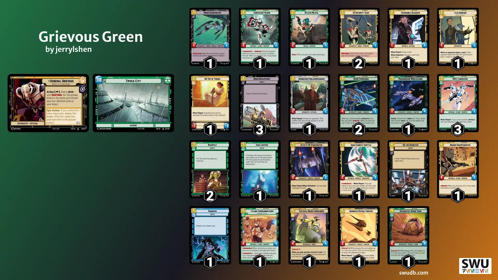 After Round1, I reexamined my cards, and decided to pivot to Grievous Green mainly due to 3 Droid Deployment cards. My new deck has a much better early game.