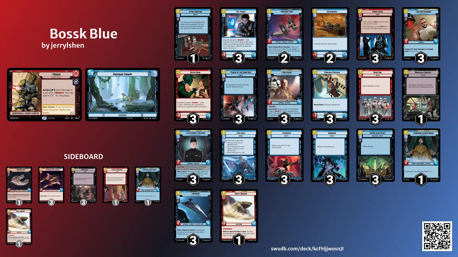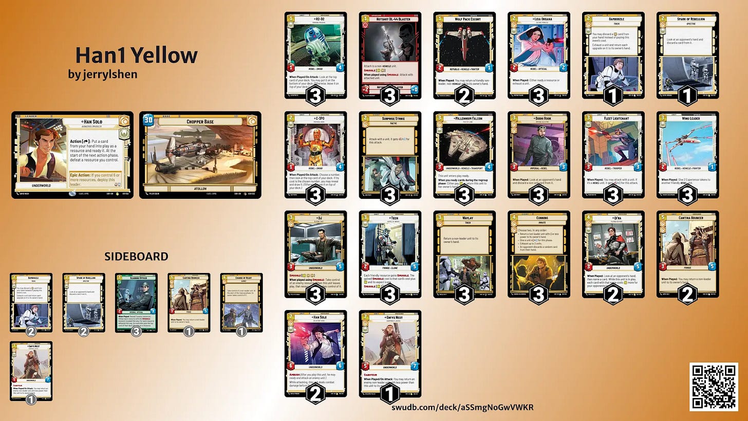 Haven’t played against the Jango Red deck so no comment on that, but I think both decks should do ok against it. I feel that Han1 Yellow is currently the premier choice for mono Yellow decks, though I have seen a Asaaj Yellow deck perform decently at CBG’s 11/19 locals (writeup coming soon). Despite my record, Bossk Blue felt decent into the field.