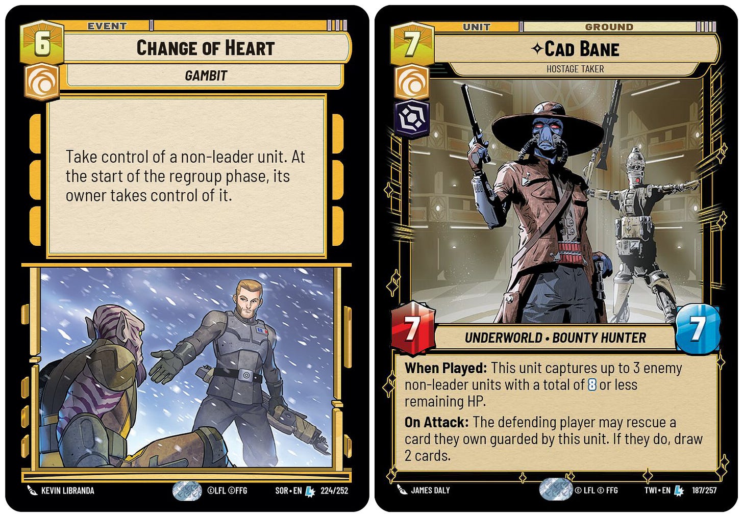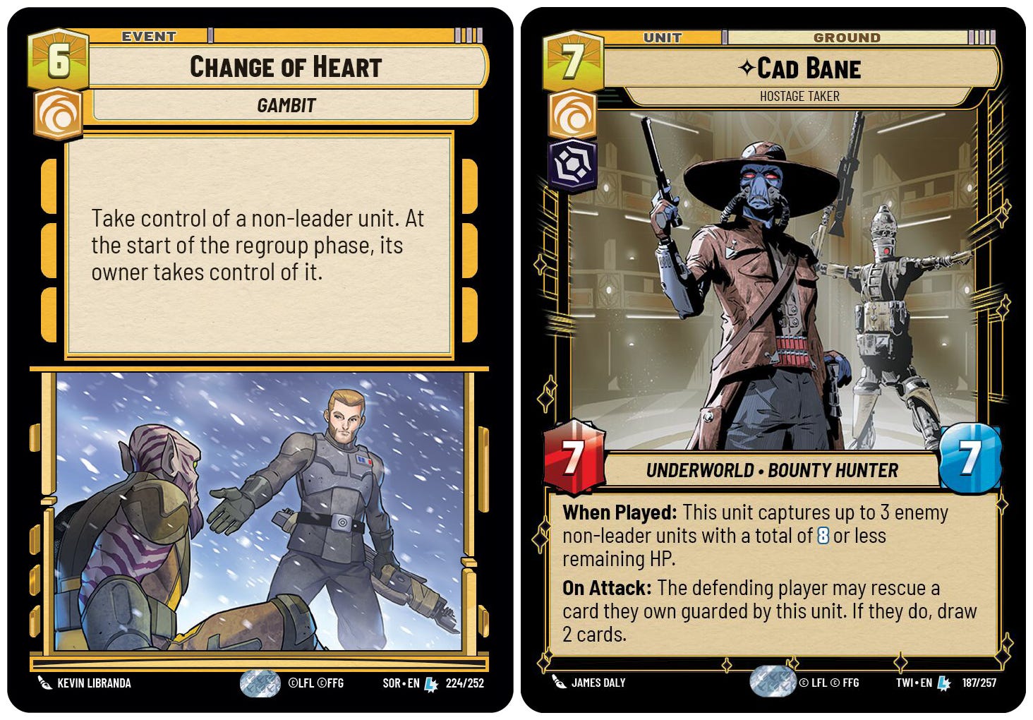 Scenario 1: Player 1 played Change of Heart on a Player 2’s unit. Player 2 captured the controlled unit with Cad Bane unit.