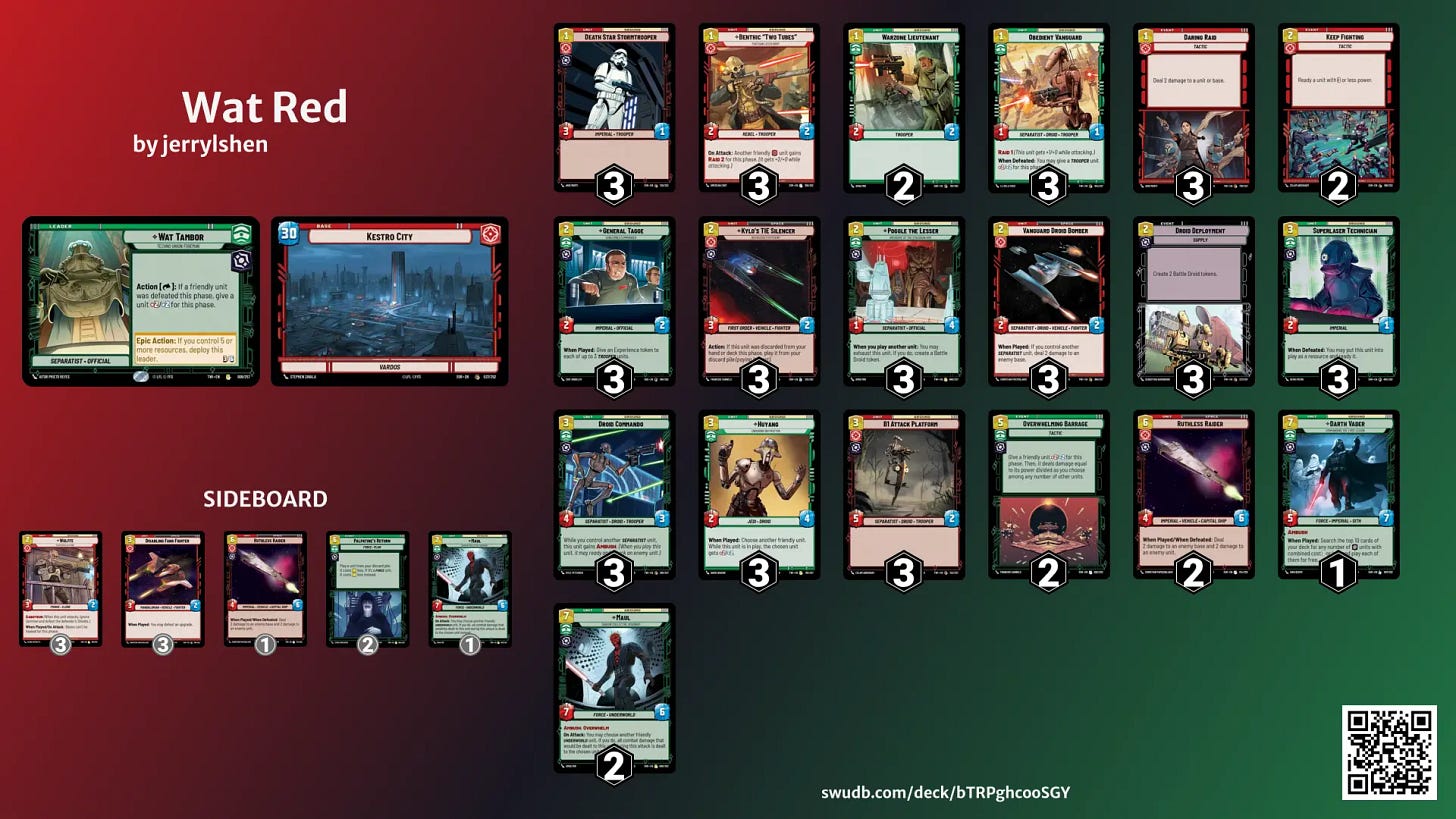 I play tested Bo1 vs Alyssa’s Sabine ECL for ~5 games early on in the pre-release timeframe, and I think it holds up in that matchup. If you look at the edit history, I initially had Tarkintown, but I found it too situational (and useless if opponent lane dodge to space) and the 5hp is needed in base race situations.