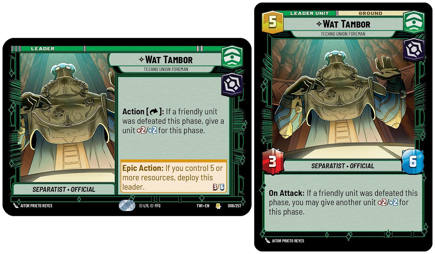 Wat’s abilities is somewhat similar to Kylo Ren leader’s ability in that it converts a card resource into a +2 power buff. The approach should be to put in high value units that encourage the opponent to trade into your units. As such, this lends the leader to be in an aggro deck.